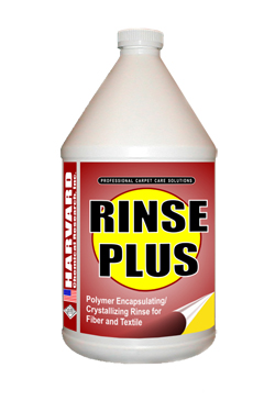 To guard against rapid re-soiling, wick back, re-staining and to leave carpets feeling soft to the touch as well as adding a luxurious sheen, carpets should be rinsed with a solution of Rinse Plus. This product will encapsulate carpet fibers for stain protection. This specialized formula can also be used to prevent browning when highly alkaline cleaning solutions have been used.