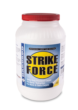 Strike Force is a super-strength highly solventized detergent that dissolves in water quickly and completely and will melt away the toughest carpet soils. This high alkaline, solvent based formula will blast off grease and grime without extended dwell time. Strike Force will penetrate, emulsify and suspend soils so they can be rinsed away freely.