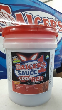 Dilute 8 –9 scoops Saiger’s Code Red (16-18 ounces) per 5 quart container with warm to hot water, and meter